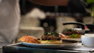 Untuk pengalaman bersantap yang lebih kasual, hadir pula Flame Burger—burger juicy dengan paduan saus khas dan aroma smoky yang menggoda. Disajikan dengan kentang goreng renyah, menu ini menjadi favorit untuk menikmati sore santai dengan cita rasa tinggi.